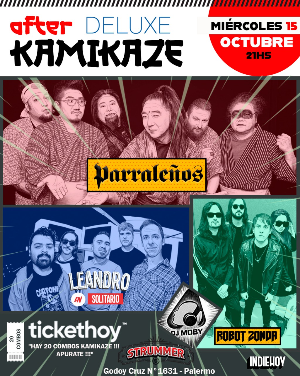 15 octubre, 2025 After Kamikaze Deluxe Get Entradas - 8000 + sc Time: 20:00 Venue: Strummer Bar Address: Godoy Cruz 1631 Country: Argentina Website: http://www.parralenos.com.ar